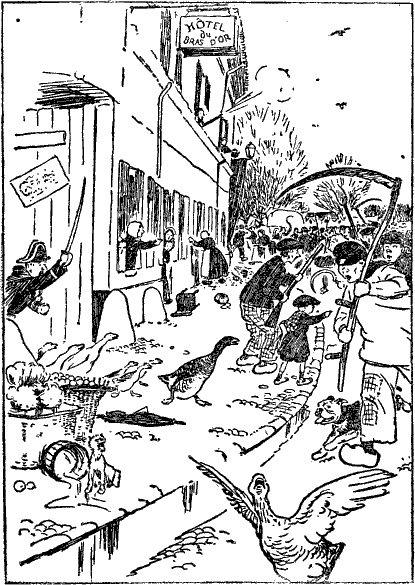 Roybon zag er dan ook niet zeer zachtzinnig uit. Hij wàs niet kwaad en hield veel van een grapje, maar dit zou men aan zijn gezicht niet zeggen. Bruingebrand door de zon, met twee litteekens, van sabelhouwen, dwars over het voorhoofd, daarbij een paar groote knevels, waarvan de einden altijd strijdlustig in de hoogte stonden, geleek hij een echte oude ijzervreter. Daarbij kwam nog, dat hij maar één been bezat. „Het andere heb ik eens aan 'n kanonskogel cadeau gegeven, die mij in den oorlog voorbijvloog,” zoo vertelde hij aan ieder, die er hem naar vroeg. Een groote sabel slingerde altijd achter hem aan, van links naar rechts en van rechts naar links, net als de staart van een kat, die op een vogeltje loert.
