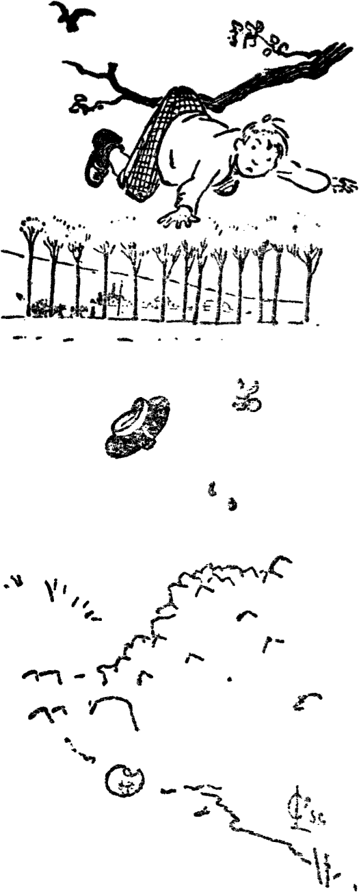 Boven in den top van den boom hing een prachtige groote appel. „Die maar 't eerst,” dacht Paul en in een wip zat hij in de takken. Nauwelijks echter had hij een grooten hap uit den appel genomen of de tak, waarop hij stond, brak.