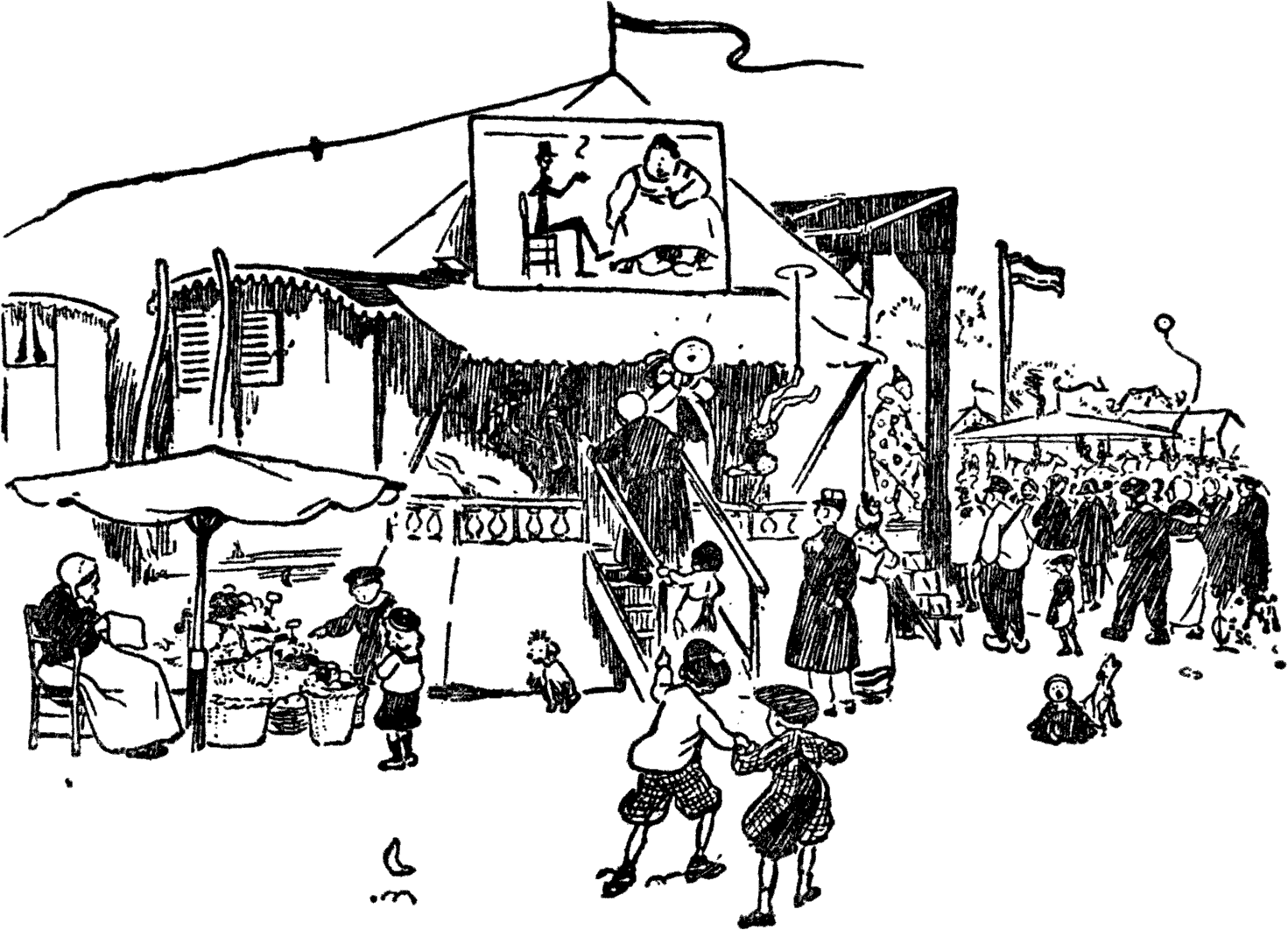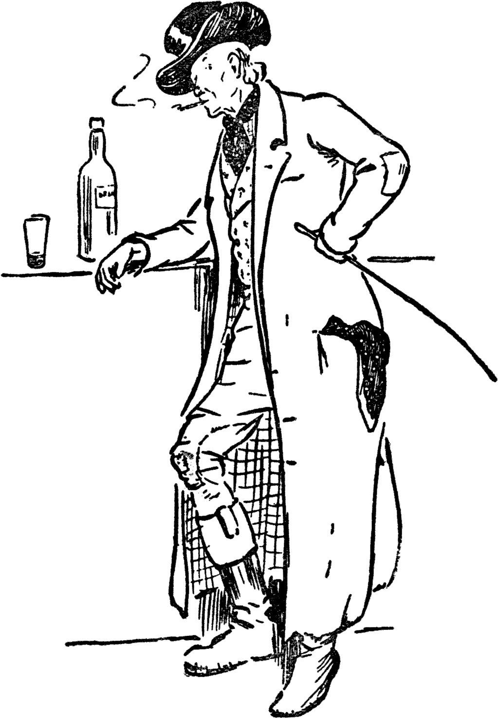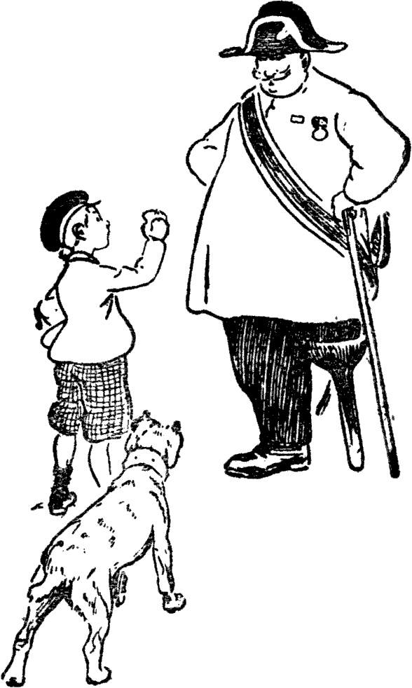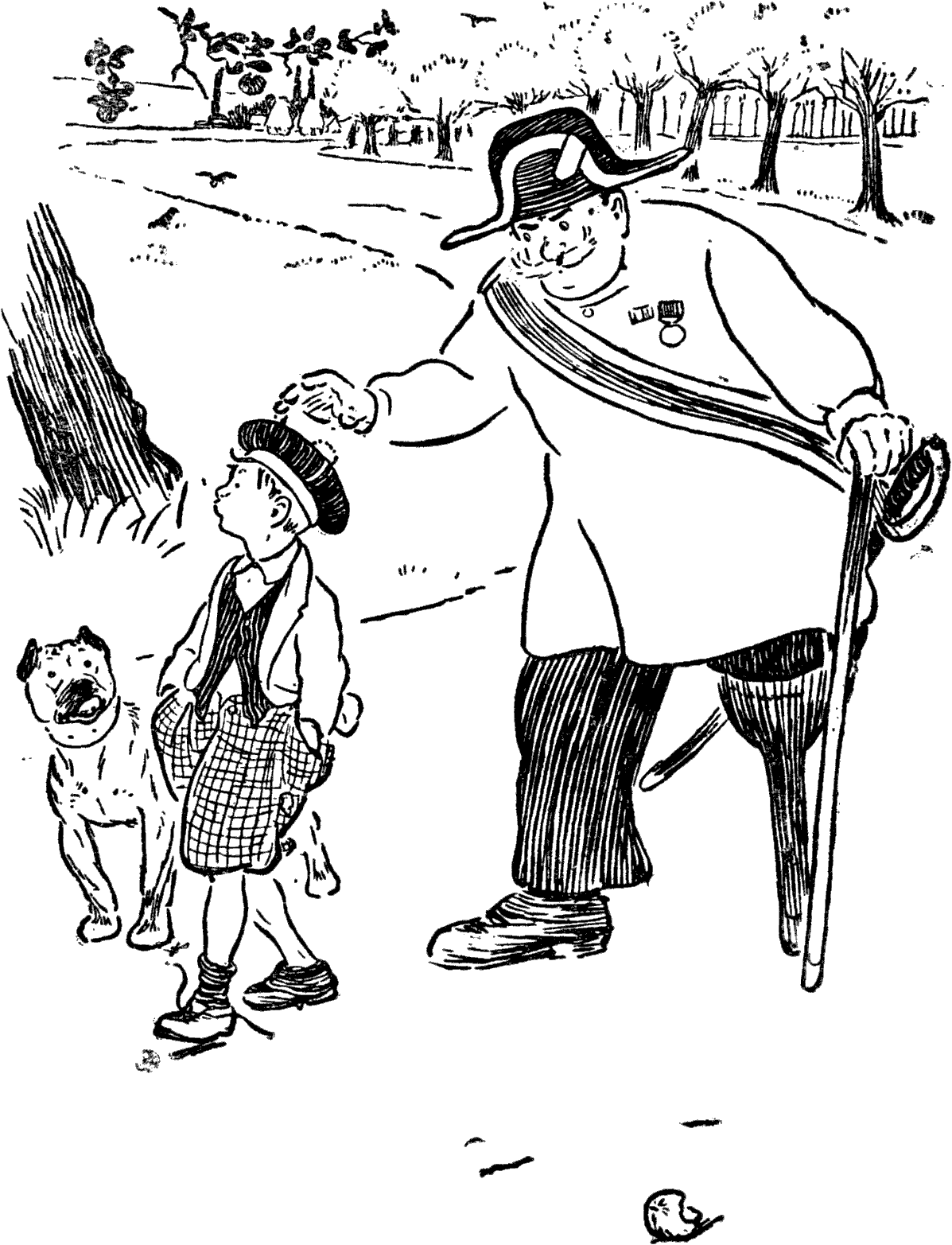 „Goedenmiddag, jongmensch,” zei hij, toen hij bemerkte dat het voorwerp een jongen was, „jij schijnt veel van appels te houden, hè? Dan lijk je mij wat; ik houd ook veel van appels, rauw of gekookt, dat komt er niet op aan, maar ik moet ze eerst gekocht en betaald hebben, hè? Kom d'r 's uit jeugdige losbol!”