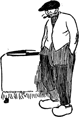 „Hé!” zei hij, „die?” en hij bekeek den appel met alle aandacht, het hoofd een beetje op zij, alsof hij daar juist een natuurwonder ontdekte. „Wel, ik denk, dat die zoo groeide... Ja, 't is waar ook,” vervolgde hij na een kleine pauze, „ik ken iemand, die heeft in zijn tuin een boom vol appelen net precies zoo'n model als deze.”