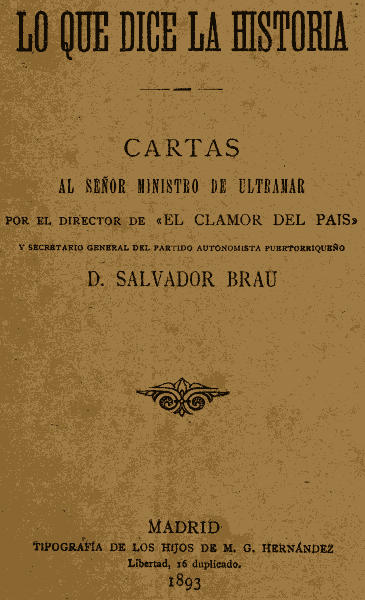 Imprímese este folleto por varios puertorriqueños residentes en Madrid y en él se reproducen LAS CARTAS AL MINISTRO DE ULTRAMAR que, con el pseudónimo de Casimiro Claro, ha publicado en El Clamor del País el Director de aquel periódico y Secretario general del Partido Autonomista Puertorriqueño, D. Salvador Brau.