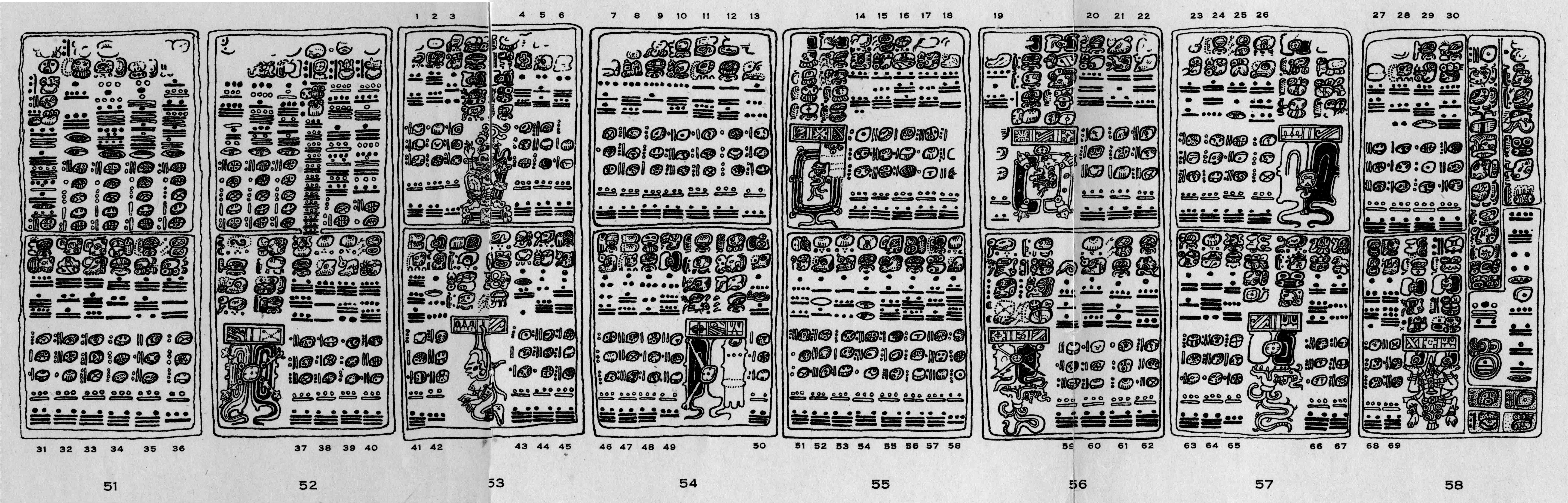 In the Dresden Codex, one of the three Maya manuscripts in existence, there is found a series of numbers covering eight pages, 51 to 58 (plate I). As early as 1886, Dr. Förstemann recognized this series as an important one, and one which probably referred to the moon in some way. Each page is divided into an upper and a lower half designated, respectively, “a” and “b.” Pages 51a and 52a form a unit in themselves, but are clearly associated with the remaining pages. The probable meaning of this group is still so doubtful that it has been deemed best to omit entirely a discussion of it at the present time. The remaining sections of these pages form one long series of numbers which should be read from left to right, beginning at 53a, reading to 58a, continuing on 51b, and ending the series at 58b.