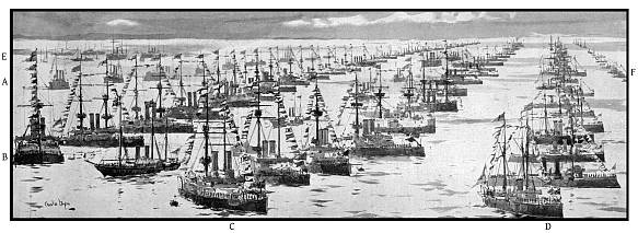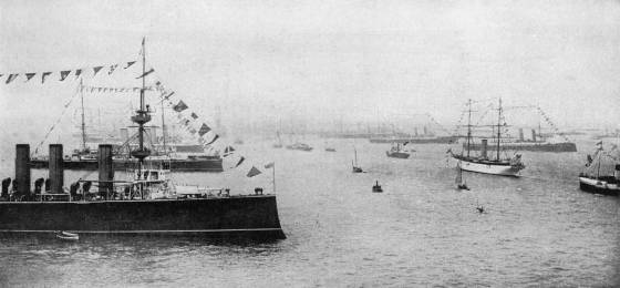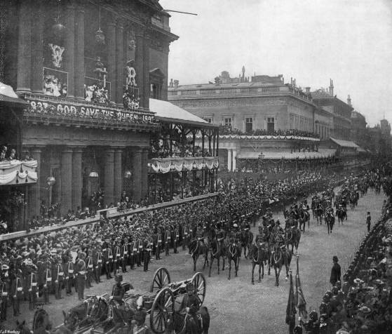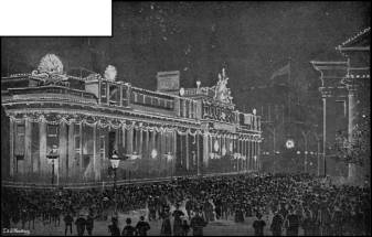 Illuminations in London—Festivities in the Provinces and the Colonies—Addresses of Congratulation from the Lords and Commons—Gathering of School Children on Constitution Hill—State Performance at the Opera—The Princess of Wales’s Dinners to the Poor—State Reception—Special Performance at the Lyceum—Torchlight Evolutions by Etonians at Windsor—Naval Review at Spithead—The Fleet Illuminated—The Colonial Troops at the Naval Review.