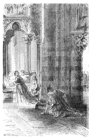 Nei dì di festa, o di obbligo di messa i cittadini sapendo com'ella costumasse recarsi al Duomo verso nona si assiepavano davanti la sua porta per vederla uscire, a mo' che si usa in parecchi paesi, nei quali i giovani fanno il serraglio dinanzi alla porta, donde la sposa si reca a marito, sicchè questa è forza, che si riscatti se pure desidera di giungere all'altare. Giusto adesso avevano fatto a quel modo, perchè correva il mercoledì delle ceneri; ed ella, cessato il carnevale delle feste e dei balli ora sta per cominciare il carnevale delle prediche: si spalanca la porta, e si leva il solito sussurro di [21] ammirazione, ed ella graziosa a tutti sorride, e tutti saluta. Dico cosa incredibile, e non di manco vera, e tutto giorno rinnuovata, cioè, che ognuno si reputava da lei singolarmente distinto, ed ella non vedeva mai persona distinta, bensì una congerie, una polenta, per modo di esprimermi, di facciacce umane.