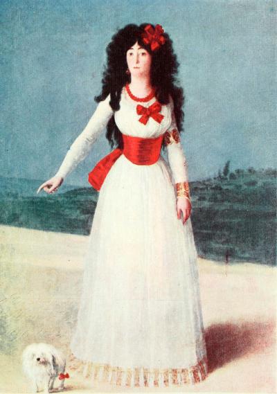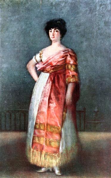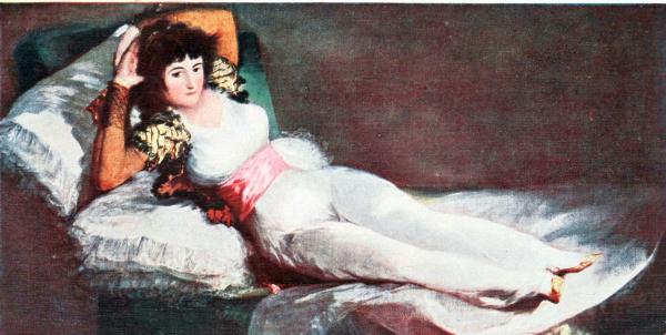 This reclining woman represents a very characteristic type of Spanish beauty. Goya has painted this picture under two different aspects, although in an absolutely identical pose. In one, the woman is represented completely nude, while here the artist has clothed her in corselet and trousers. It is asserted that the Duchess of Alba served him as model for both of these pictures.