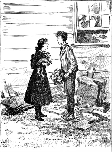 Lammy felt like crying, too, and in fact a tear rolled so far down on his cheek that he had to struggle hard to lick it up, for Bird was his dear friend, the only girl in the village who had never laughed at him or called him “Nose-in-the-Air,” or “Look-up-Lammy,” and seemed to understand the way in which he saw things. At first he looked around helplessly, and then remembering that his mother had gone, and that he must get Bird down to his home before supper-time, he blurted out: “Say, don’t you reckon Twinkle’s pretty hungry by this? I guess we’d better get him some feed down to my house, and you can leave these red pineys over yonder as we go along if you like.”