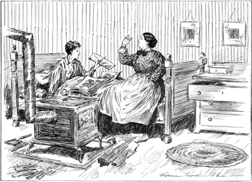 “Here, let me wash your face and freshen you up a bit,” said Mrs. Lane, whisking out a clean handkerchief and dipping it in the water bucket, while at the [9]same time she put her arm around Bird to cut off her retreat. “Now, that is better. Just a sip of tea, dearie, and a bite, and then go out and get a mouthful of air, while I open up the windows, for it’s sizzling in here if it does lack two days yet of almanac summer.”