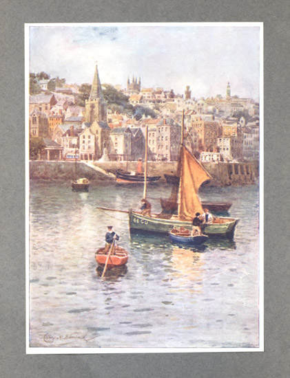Guernsey, however, though thus irritatingly spoilt in its interior—for the visitor comes to see beautiful scenery, and not to assist at a horticultural triumph—still possesses in its south coast a feature of distinction that neither recklessness nor greed of money has so far been able to spoil. It also possesses in St. Peter Port a capital so pleasant, and withal so picturesque, that it makes one desiderate all the more keenly the beautiful environment in which it was once set. Approaching this port in the early morning light, 36 the colour and grouping of the little town seem almost fantastically correct. Surely this more resembles an imaginary sketch than a city actually realized in this commonplace, workaday world. St. Peter's Church, in the middle of the picture, has just the required outline, and is set in just the right place. The tall, brown houses behind it, with their mellow red roofs, are of just the right colour, and in just the right number. The new church of St. Barnabas is just rightly designed, and is built just exactly where it ought to be built. And lastly, the wooded amphitheatre behind all, with its sprinkling of white villas, is just neither more nor less than such a background ought to be. A composition like this on the drop-scene of a theatre would scarcely surprise us, but here we rub our eyes. We land; and the cheerful anticipation of the sea-view is hardly hurt at all by contact with actual fact. A pleasanter little town than this, or more full of bustling happiness, is not readily conceived. Darker aspects no doubt are there, but they do not obtrude on the casual view.