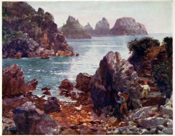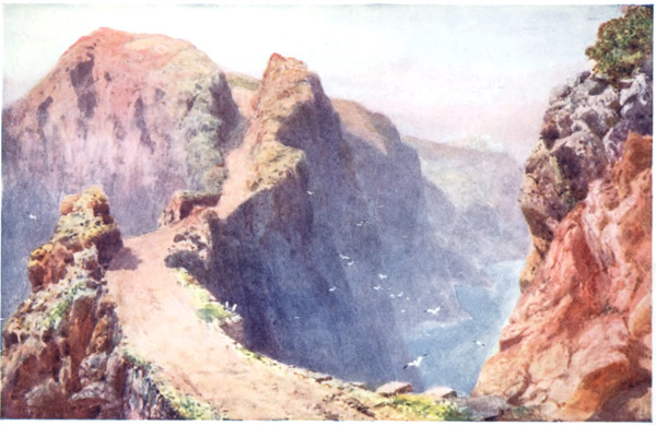 The walk across the south coast of Jersey, from Mont Orgueil to the Corbière, taking the train for the four dull miles, where there is nothing to see, between St. Helier and St. Aubin, will probably almost exhaust, except for the archæologist of the Dry-as-Dust school, the artificial attractions of the island of Jersey. Of course, there are other antiquities to see: St. Ouen's Manor, for example, now recently restored, and the ancient house of the Carterets; the cromlechs at Gorey and the Coupéron; and the seven old churches that we have not yet visited. But when we have seen the wall-paintings at St. Brelade's and St. Clement's; have inspected Elizabeth Castle, and the curious font at Prince's Tower; and, above all, have made every stick and stone of Mont Orgueil our own treasured possession, it will be time for most of us to turn our attention, less to the artificial attractions of Jersey, than to its 28 wonderful natural beauties. It is lucky that these lie mostly on the north coast, which is well out of reach of St. Helier. It would be sad indeed if this silent succession of bays, stretching in stern sublimity from Grosnez Point to the long useless breakwater on the south of Fliquet Bay, were infested with tea-gardens, and boarding-houses, and villas. For this twelve miles of coast is both wholly unspoilt, and one of the loveliest imaginable. Brakes, no doubt, in the season, with their hordes of jolly trippers, invade for a few hours the sacred silences of Grève de Lecq and Rozel Bay. These, however, are limited to definite times and places; nor will it be hard for the quiet lover of Nature to evade their unwelcome gaieties. Every inch of this glorious stretch of coast should be walked over, if possible; should often be revisited; and should be lingered over lovingly. Where else have these rose-red cliffs a counterpart, jutting out into the bluest, or most emerald, of seas, and haunted by myriads of clanging sea-fowl, unless it be on the borders of lost Lyonesse? Waters that rest on a granite bed are always of amazing translucency—