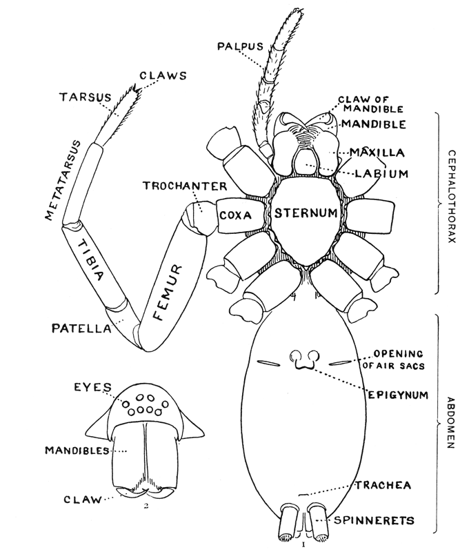 The front half of a spider's body, called the cephalothorax, contains in one piece the head and thorax, the only outward division between them being shallow grooves from the middle of the back to the front legs. In the middle of the cephalothorax is usually a groove or depression, under which, inside, is a muscle that moves the sucking apparatus by which food is drawn into the mouth. At the sides of the thoracic part are four pairs of legs, and on the head part are a pair of palpi and a pair of mandibles. The legs have seven joints: (1) the coxa, the thick basal joint, having little motion; (2) the trochanter, a short joint moving very freely on the end of the coxa; (3) the femur, the largest joint of the leg, moving with the trochanter in all directions; (4) the patella, moving up and down on the end of the femur; (5) the tibia, joined closely to the patella and moving with it up and down; (6) the metatarsus; and (7) the tarsus, moving together on the end of the tibia. The palpi are like small legs and have one less joint than the walking legs. The mandibles are close together at the front of the head (fig. 2). They are two-jointed, the basal joint stout and the end joint or claw slender and sharp-pointed. The claw has near its point a small hole, which is the outlet of the poison gland. The poison kills or disables the insects which are captured by the spider. Its effect on the human skin varies in different persons; sometimes it has no effect at all; oftener it causes some soreness and itching like the stings of mosquitoes and bees, and cases have been known in which it caused serious inflammation which lasted a long time. Spiders seldom bite, and only in defense, the bites so commonly charged to them being often the work of other animals.