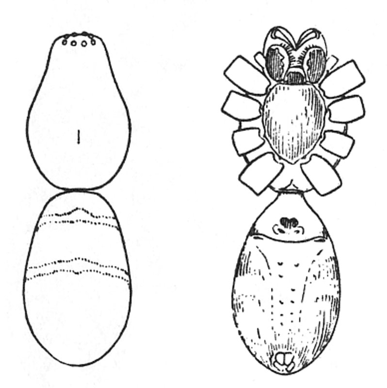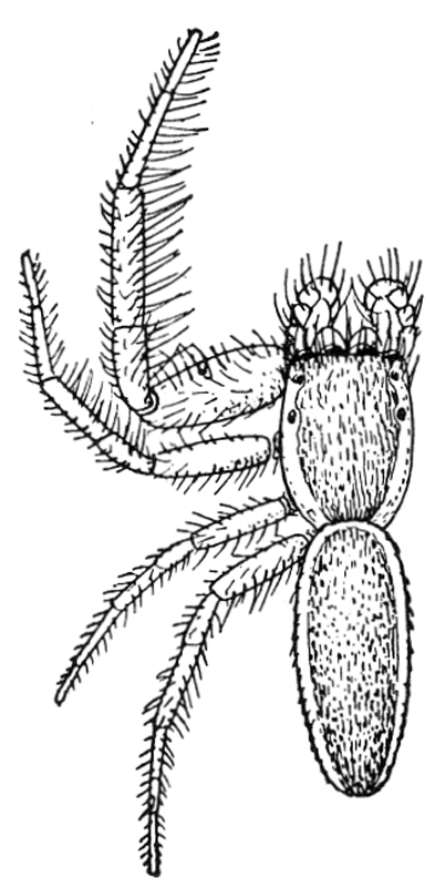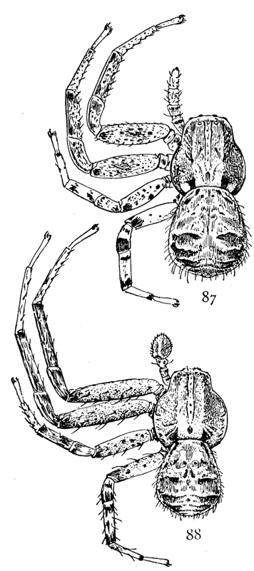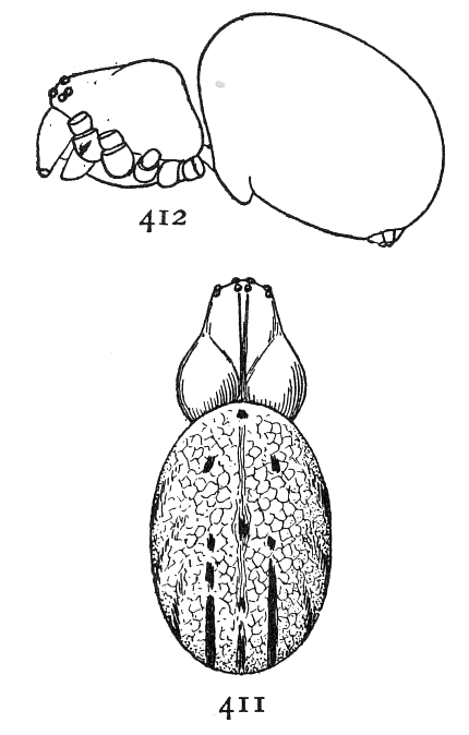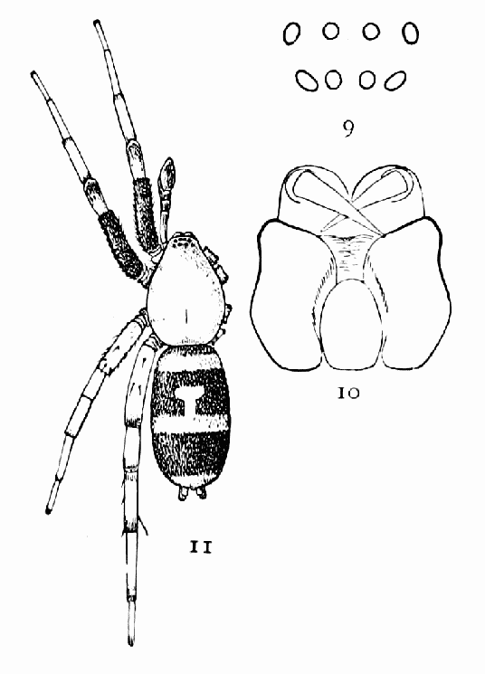 The Drassidæ, like the Lycosidæ (p. 67), are ground spiders, though some genera, like Anyphæna (p. 12) and Clubiona (p. 15), are equally common in summer on bushes. They make nests in the form of a bag or flattened tube, but no cobwebs for catching insects, and are commonly found running about among dead leaves and short grass and sometimes even on bare ground and sand. In form they are usually two or three times as long as they are wide, like the Lycosidæ (p. 67), but more often flattened on the back. The legs differ but little in length, and the first and second pairs are directed forward, the third and fourth backward. Their hairs and spines are short, giving them a smooth, velvet-like appearance. The feet have two claws, with a brush of flattened hairs under them, like the Thomisidæ and Attidæ (p. 41), but unlike the Lycosidæ (p. 67), which have three claws. The mandibles are large and strong and are together as wide as the head. The eyes are all about the same size and arranged in two rows of about the same length and not far apart, but between different species there are slight differences in their arrangement. The colors are usually dull gray, brown, and black, with few markings or none. A few species are very brightly marked, as in Micaria (p. 9) and Pœilochroa (p. 4).