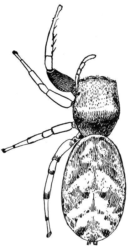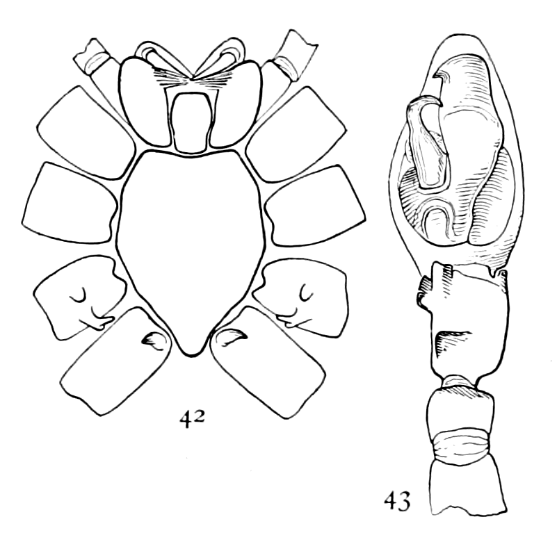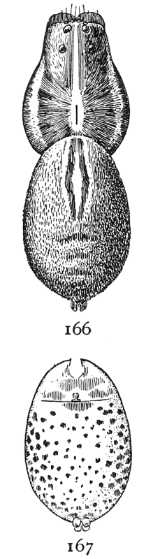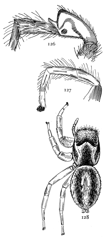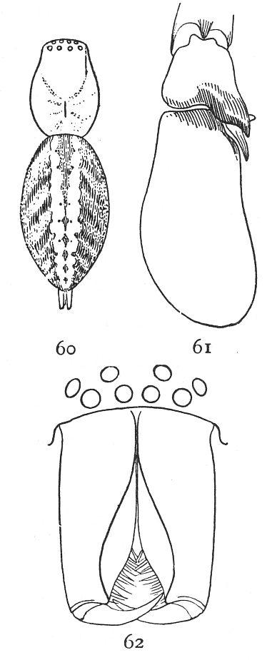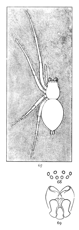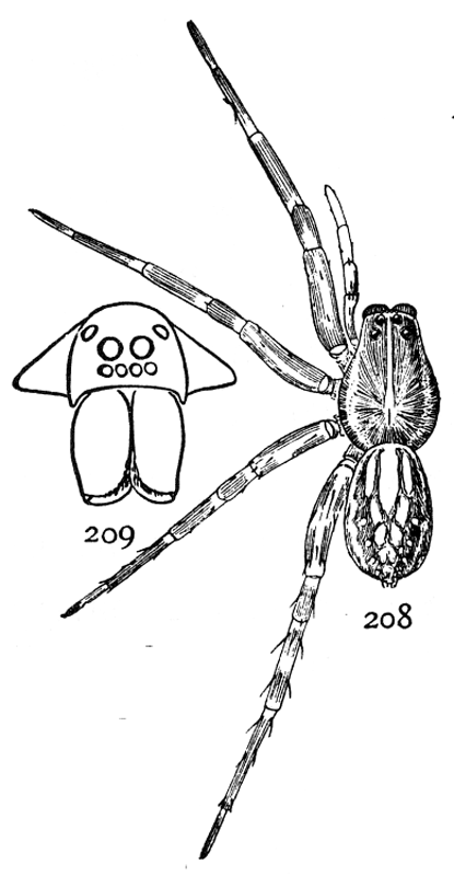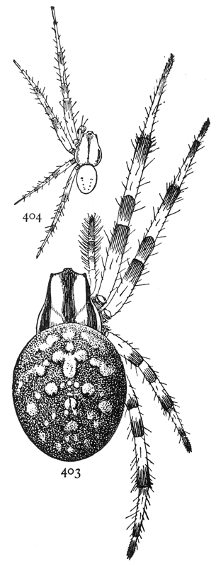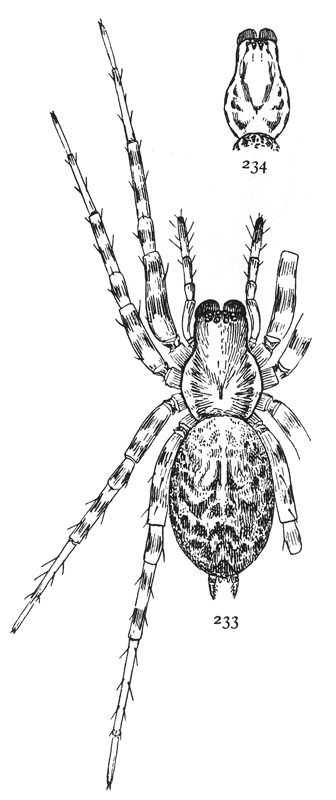 In the following pages a general description is given of each family, followed by descriptions of the species belonging to it, with a figure of each species placed as near as possible to the description. In some cases, where the genera are large and well defined, separate descriptions are given of each genus, but where the genus is not easy to distinguish or represented by only a few species, there is no separate generic description, and the species are placed next to those of other genera to which they are most closely related. If the names of spiders are known, they can readily be found by the index at the end of the book. If information is sought about an unknown spider, the illustrations through the book furnish the most convenient index, as the general form and proportions of spiders and the arrangement of their eyes usually show to what family they belong. The ground spiders and those without cobwebs are described first, and the sedentary species living in webs in the last half of the book. Readers unfamiliar with the subject are advised to read first the descriptions of the families and compare with them the spiders that they find in their own neighborhoods. The figures are in most cases enlarged for the sake of distinctness, and spiders of much smaller size must be looked for.