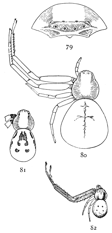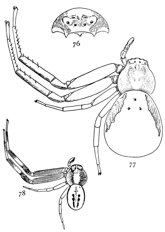 The hunting spiders include: (1) the Dysderidæ (p. 22), a few species with six eyes only and with four breathing holes at the front end of the abdomen; (2) the Drassidæ (p. 1), or ground spiders, which live among stones and dead leaves or among plants, making tubular nests and flat egg cocoons but no cobwebs; (3) the Thomisidæ (p. 24), the flat and crab-like spiders living on plants or under bark and stones; (4) the Attidæ (p. 41), the jumping spiders, with wide heads and large front eyes, many of them brightly colored and active in their habits; (5) the Lycosidæ (p. 67), the long-legged running spiders, living on the ground and, a few of them, in holes and carrying about their round egg cocoons attached to the spinnerets.
