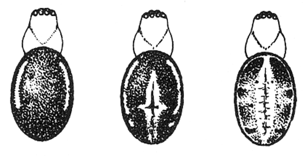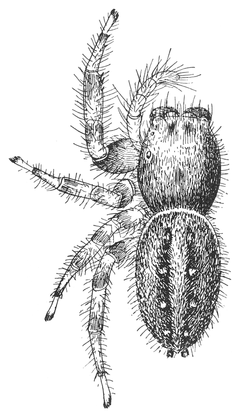 The colors of spiders are partly in the skin itself and partly in the hairs and scales that cover it. Almost all spiders are covered with hair of some kind, but in some species it is so fine and short that it has little effect on the color. In others the skin is entirely covered with hairs of various lengths and sometimes with scales somewhat like those of butterflies, flattened and feathered or toothed on the edges. The colors of spiders are very varied, and in many species, especially of the jumping spiders, as brilliant as those of butterflies. The most common colors are grays and browns, resembling the ground or plants and stones among which the spiders live. Sometimes the color is uniform all over the body, except that it is a little darker toward the head and the ends of the feet. The most common marking is a spot on the front of the abdomen over the spider's heart, sometimes merely a translucent part of the skin and sometimes a definite color spot darker in the middle and outlined with a lighter shade or white. The hinder half of the abdomen is often marked with several pairs of spots, becoming smaller toward the end, and these spots may be united into a pair of stripes or a more complicated pattern. (See figures.) The legs are often marked with rings of color,[Pg xii] almost always at the ends of the joints. Besides these common markings there are in some spiders strong contrasts of color, such as bright red or yellow spots on a black ground. In the males, especially among the Attidæ, there are often shining scales that reflect different colors in a bright light, and tufts of black or white hairs about the head and front legs.