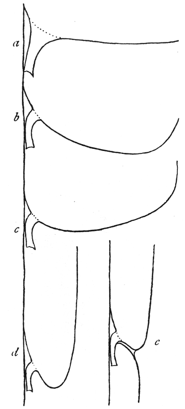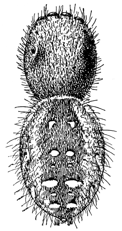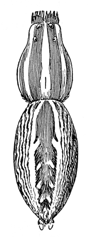 The hinder half of the body, the abdomen, is connected with the cephalothorax by a narrow stem (fig. 1). It has at the hinder end the spinnerets, three pairs of appendages having at their ends a great number of microscopic tubes through which the thread is drawn out. When not in use the spinnerets are folded together, so that the smaller inner pair are concealed.