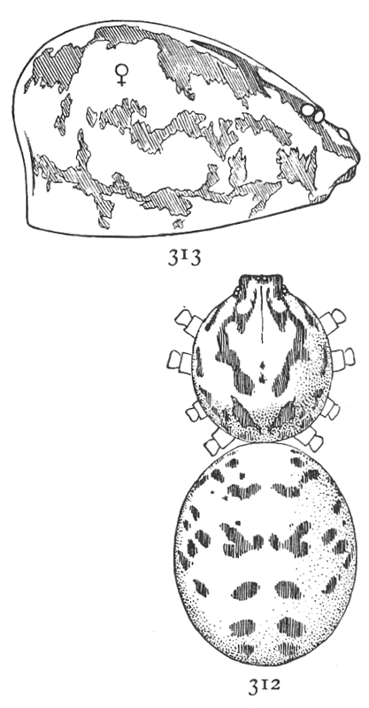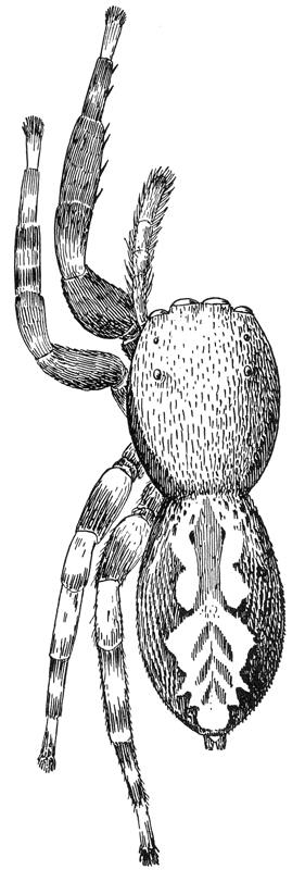 Some species live on walls and fences, making large webs that become conspicuous from the dust which they collect. Others prefer the tops of plants like stiff grass and the tops of golden-rod and spiræa. Others, like volupis (fig. 474), prefer leaves and the ends of growing branches. The webs are usually irregular, but sometimes are nearly round and formed by threads radiating from the spider's hole, crossed irregularly by other threads (fig. 471).