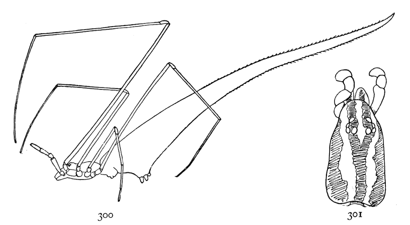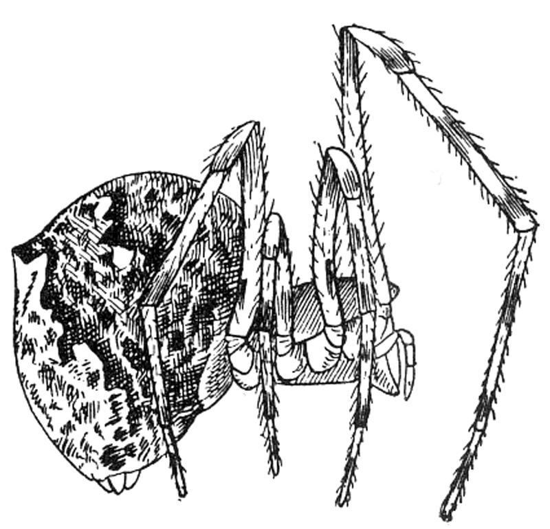 Filistata hibernalis.—One of the most common house spiders in the southern states, making webs in corners and on walls and fences (fig. 501). The body is about half an inch long, but the legs are so long and stout that it appears much larger. The first leg, which is the longest, is about twice the length of the body. The palpi are as long as the cephalothorax and thicker than in most spiders. The maxillæ are inclined toward each other so that they meet in front of the labium. The cephalothorax is flat and narrowed in front between the palpi, and the mandibles are small. The eyes are in one group, close together. The color is dark gray, without any markings, and the whole body is covered with fine short hairs. The calamistrum is very short, and near the base of the fourth metatarsus, where it can easily be seen. The web is like that of Dictyna, radiating irregularly from the spider's hiding place, and when this is on a flat wall forms sometimes a circle a foot or more in diameter, which becomes filled with dust and is enlarged and thickened as the spider grows.