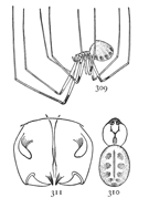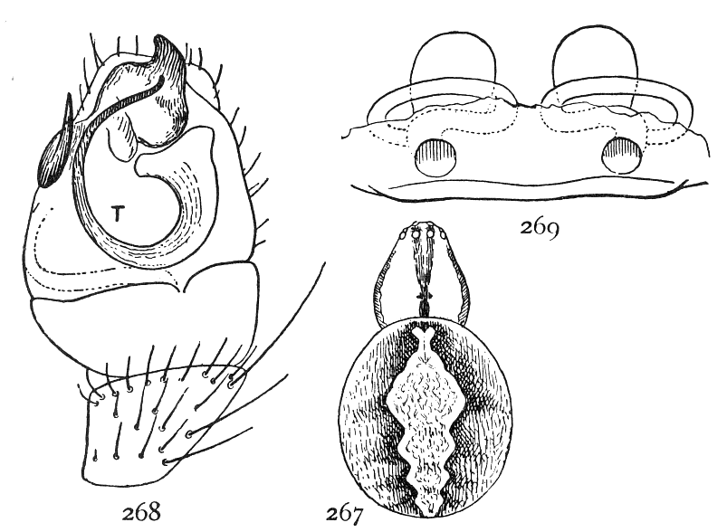 In front of the spinnerets on the under side is a small opening to the tracheæ, or air-tubes (fig. 1). At the front of the abdomen on the under side is a transverse fold of the skin, at the ends of which are the openings of the air-sacs or[Pg xi] lungs, and between them the opening of the reproductive organs (fig. 1). The latter is covered in females by an apparatus, sometimes large and complicated, called the epigynum. Its presence shows that the female is full grown. Young spiders do not have it. Male spiders have the ends of the palpi enlarged, and under the terminal joint what is known as the palpal organ, sometimes very complicated in shape. The presence of these organs shows that the male is full grown. Young males that have nearly reached maturity have the ends of the palpi simply enlarged. Male spiders almost always have the body smaller and the legs longer than females of the same species.
