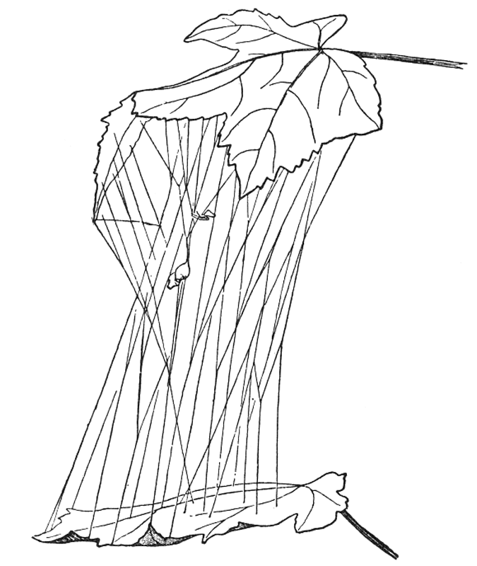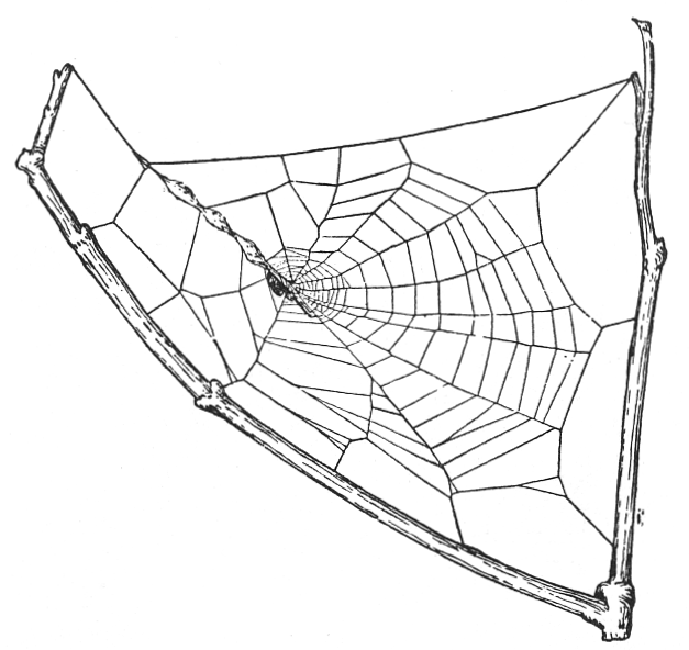 2. The net-like webs, made of smooth threads in large meshes, sometimes in a flat or curved sheet held out by threads in all directions. The spider lives on the under side, back downward. These are made by Therididæ and Linyphiadæ (pp. 107, 134).