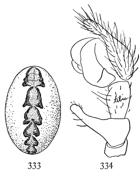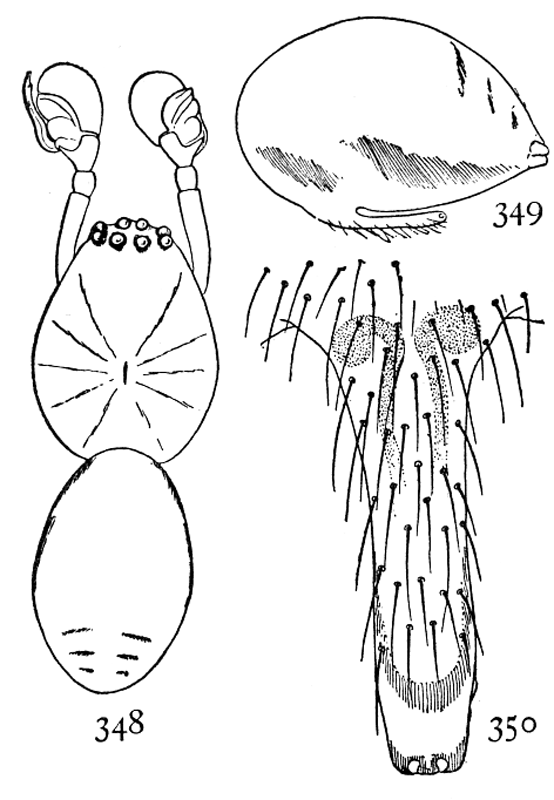 Dictyna cruciata.—About a tenth of an inch long, with the abdomen large and oval, as in muraria. The cephalothorax is light brown above and below, and the legs the same color, but still lighter. The abdomen is gray beneath and at the sides, and silvery white on the back, sometimes over the whole upper surface, but oftener in a stripe widened in the middle so as to form a white cross on a gray ground (fig. 482). The males are darker colored, with the light spot on the abdomen smaller. The male palpi are short and slender, the ends large and rounded and carried close to the head (fig. 483).
