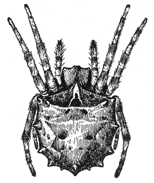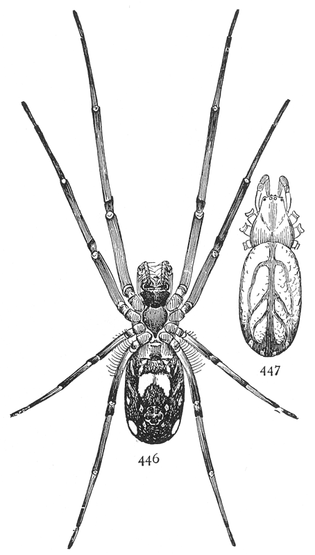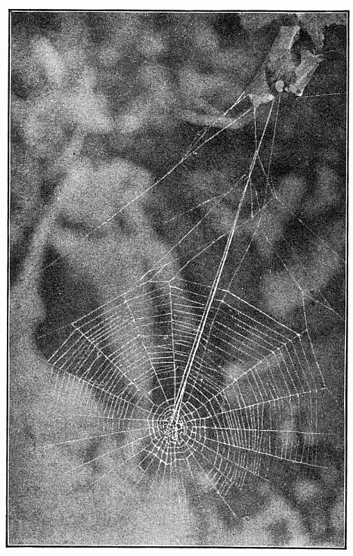 The web (fig. 500) consists of four rays crossed by a dozen or more threads. The point where the rays meet is attached to a thread which extends to the spider's roost, usually the end of a twig. Here it holds on by the hind feet and draws the thread tight with the fore feet. When an insect strikes the web the spider lets go with the hind feet and is jerked forward by the contraction of the web, and slides along toward its[Pg 220] center, where it finds the prey and takes it out of the web to its perch. The making of this web has been described by Wilder in the Popular Science Monthly in 1875. The cross threads are made separately, beginning with the longest. They are begun on the upper ray, the spider walking toward the center, combing out the threads with its hind legs, until it reaches a point where it can cross to the next. It is found all over the country, usually in the pine woods.