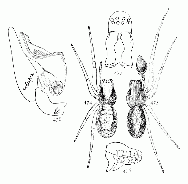 Figs. 474, 475, 476, 477, 478. Dictyna volupis.—474,