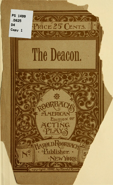 Deacon.—Acts I, II and IV. Old-fashioned-cut pantaloons, dotted vest, old-fashioned easy fitting coat; ditto shirt collar; broad brimmed, light felt hat; square watch fob dangling from watch pocket; square glass spectacles; white bald wig and white throat whiskers. Act V. Old-fashioned dark cloth suit; rose on lapel of coat.
