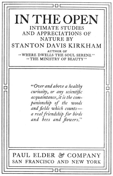 It is worth while to be out-of-doors all of one day, now and then, and to really know what is[Pg 2] morning and what evening; to observe the progress of the day as one might attend a spectacle, though this requires leisure and a free mind. The spirit of the woods will not lend itself to a mere fair-weather devotion. You must cast in your lot with the wild and take such weather as befalls. If you do not now and then spend a day in the snow, you miss some impressions that no fair weather can give. When you have walked for a time in the spring shower, you have a new and larger sympathy with the fields. The shining leaves, glistening twigs, jeweled cobwebs and the gentle cadence of the falling rain all tell you it is no time to stay indoors.