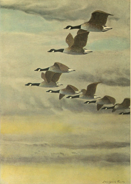 A flock of wild geese on the wing is no less than an inspiration. When that strong-voiced, stout-hearted company of pioneers pass overhead, our thoughts ascend and sail with them over the roofs of the world. As band after band come into the field of vision—minute glittering specks in the distant blue—to cross the golden sea of the sunset and disappear in the northern twilight, their faint melodious honk is an Orphean strain drawing irresistibly.