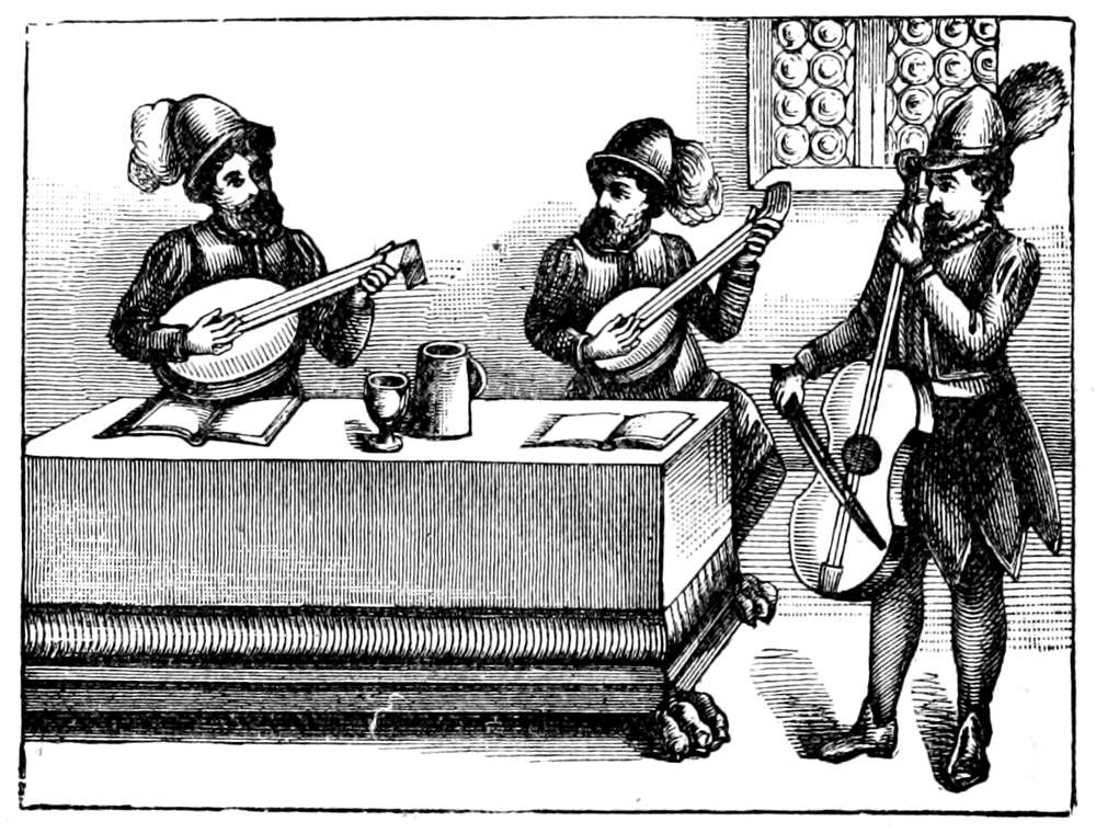 The “great violins” were, in the first half of the sixteenth century at least, according to all appearance played in two ways. From the drawing in Judenkünig’s treatise, a mode of handling is seen which requires no further explanation. That the handling of the “great violin” represented by Judenkünig without any explanation is treated of as not exceptional appears also from the accompanying vignette of another publication of that period.