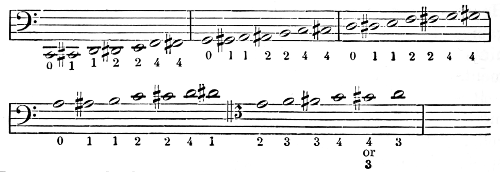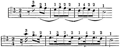 [96] Here is an example or two: Alexander in his cello school, which appeared in 1801, takes up quite arbitrarily an “ordinary,” a “half,” and a “whole,” as well as a “mixed” THEORY OF FINGERING, and Fr. Kummer divides the fingerboard into “whole” and “half” positions. Müntzberger says in his cello school, which appeared apparently in 1800, he wished that people could accustom themselves to say to the pupil as for the violin: “take this or that position.” Here is given a distinct indication of the application of the violin positions. In other cello schools, on the contrary, there is no reference to positions.