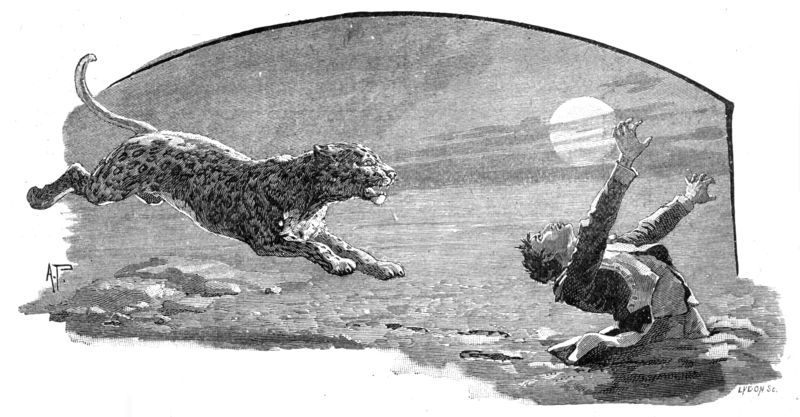 "Well!" he said to himself, "she must have taken a fancy to me. Perhaps she has never yet met anyone. It is flattering to be her first love!" At this moment the Frenchman fell into a shifting quicksand, so dangerous to the traveller in the desert, escape from which is hopeless. He felt that he was sinking; he gave a cry of terror. The panther seized him by the collar with her teeth, and springing backwards with stupendous vigour drew him from the gulf as if by magic.