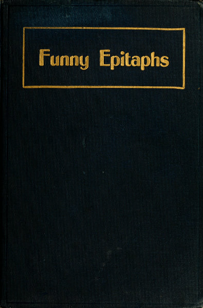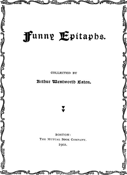 The Project Gutenberg EBook of Funny Epitaphs, compiled by Arthur Wentworth Eaton This eBook is for the use of anyone anywhere at no cost and with almost no restrictions whatsoever. You may copy it, give it away or re-use it under the terms of the Project Gutenberg License included with this eBook or online at www.gutenberg.org Title: Funny Epitaphs Compiler: Arthur Wentworth Eaton Release Date: May 3, 2013 [EBook #42634] Language: English Character set encoding: ISO-8859-1 *** START OF THIS PROJECT GUTENBERG EBOOK FUNNY EPITAPHS *** Produced by Chris Curnow, Paul Clark and the Online Distributed Proofreading Team at http://www.pgdp.net (This file was produced from images generously made available by The Internet Archive)