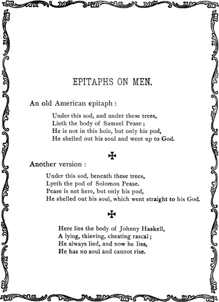 There is an epitaph of an eccentric character that may be seen on a tombstone at the burying-grounds near Hoosick Falls, New York. It reads: