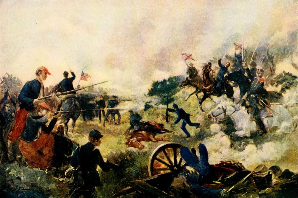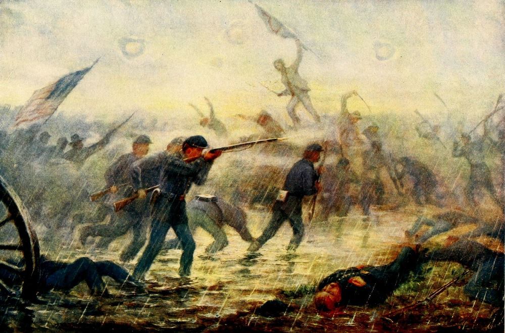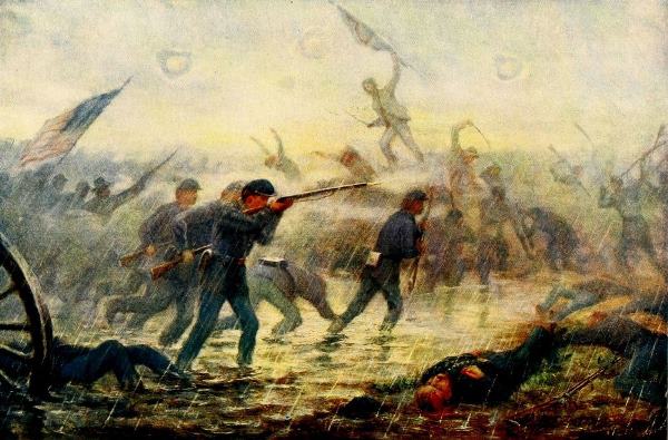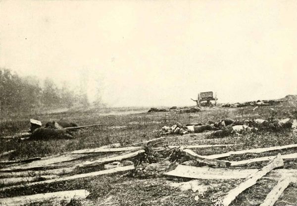 It was nearing ten o’clock. The rays of the summer sun were beating in sweltering heat upon the waiting troops. Those who could find shelter beneath the trees moved from their places into the shade. Heavy banks of storm clouds were gathering on the horizon, giving promise of relief from oppressive warmth. A silence settled over the ranks of the Confederates as they watched the edge of the woodland for the first appearance of the approaching troops.