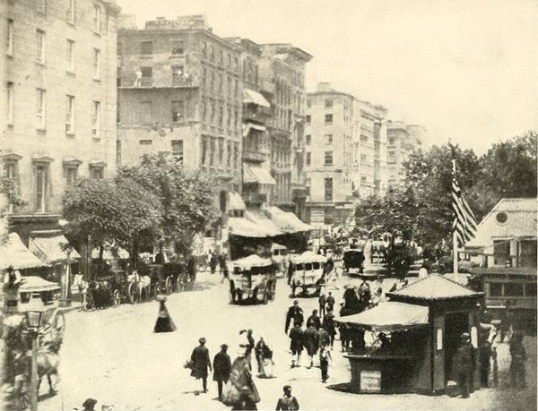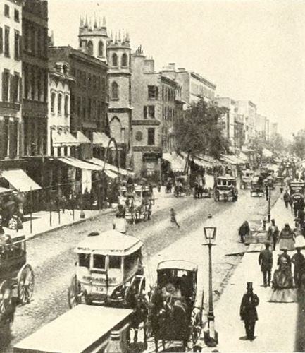 Looking north on Broadway from “The Park” (later City Hall Park) in war time, one sees the Stars and Stripes waving above the recruiting station, past which the soldiers stroll. There is a convenient booth with liquid refreshments. To the right of the picture the rear end of a street car is visible, but passenger travel on Broadway itself is by stage. On the left is the Astor House, then one of the foremost hostelries of the city. In the lower photograph the view is from the balcony of the Metropolitan looking north on Broadway. The twin towers on the left are those of St. Thomas’s Church. The lumbering stages, with the deafening noise of their rattling windows as they drive over the cobblestones, are here in force. More hoop-skirts are retreating in the distance, and a gentleman in the tall hat of the period is on his way down town. Few of the buildings seen here remained half a century later. The time is summer, as the awnings attest.