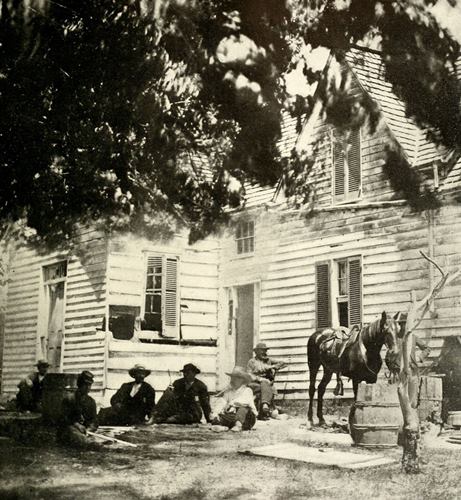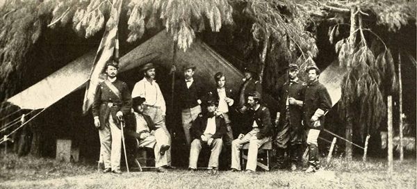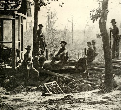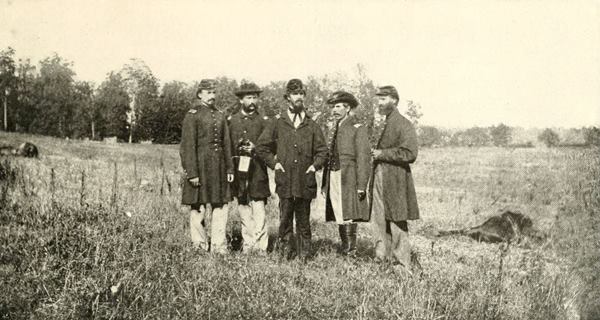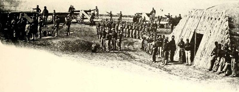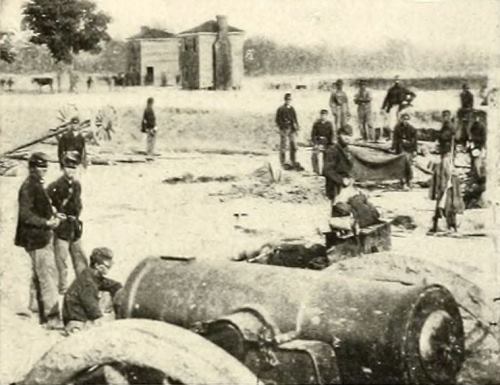 Wade Hampton (the tallest figure) and other leading South Carolinians inspecting the effects of the cannonading that had forced Major Anderson to evacuate, and had precipitated the mightiest conflict of modern times—two days before.