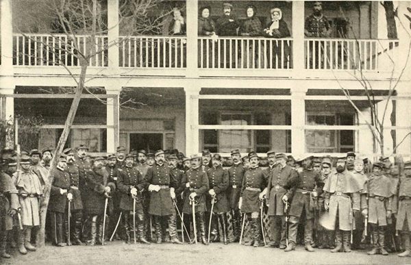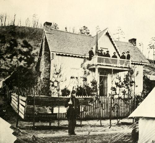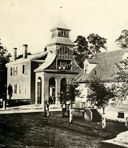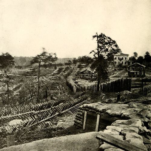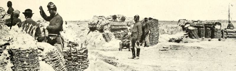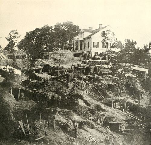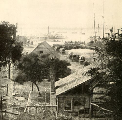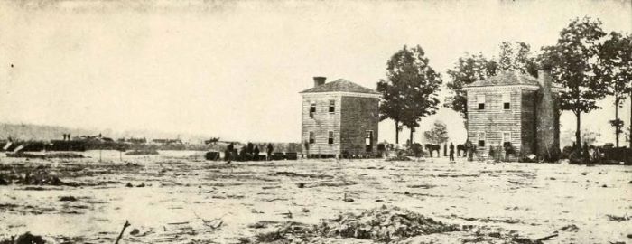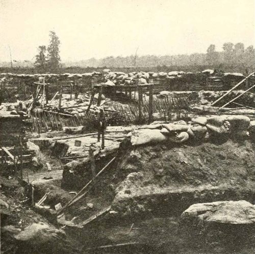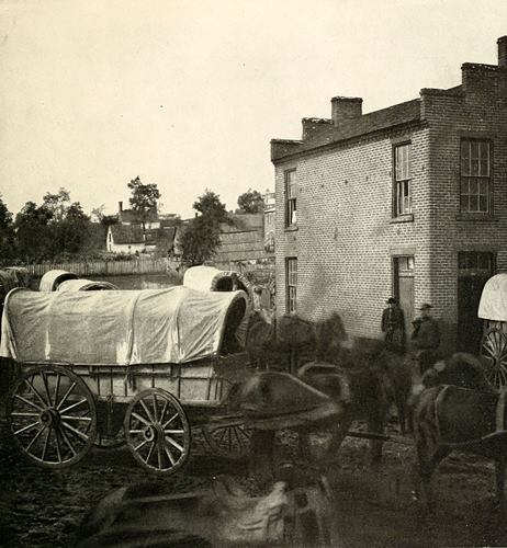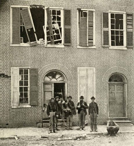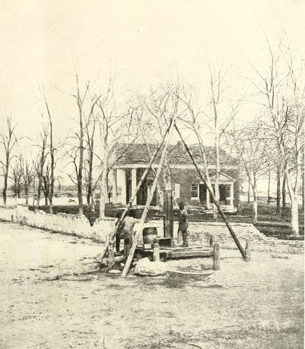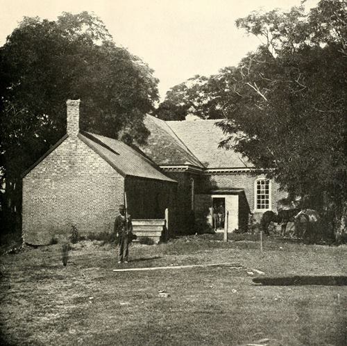This fine mansion on Bolingbroke Street, the residential section of Petersburg, has now, on the 3d of April, fallen into the hands of straggling Union soldiers. Its windows have long since been shattered by shells from distant Federal mortars; one has even burst through the wall. But it was not till the night of April 2d, when the retreat of the Confederate forces started, that the citizens began to leave their homes. At 9 o’clock in the morning General Grant, surrounded by his staff, rode quietly into the city. The streets were deserted. At length they arrived at a comfortable home standing back in a yard. There he dismounted and sat for a while on the piazza. Soon a group of curious citizens gathered on the sidewalk to gaze at the commander of the Yankee armies. But the Union troops did not remain long in the deserted homes. Sheridan was already in pursuit south of the Appomattox, and Grant, after a short conference with Lincoln, rode to the west in the rear of the hastily marching troops. Bolingbroke Street and Petersburg soon returned to the ordinary occupations of peace in an effort to repair the ravages of the historic nine months’ siege.