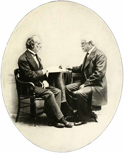 There remained for Lee the bare possibility, by desperate fighting, of breaking through the Federal lines in his rear. To Gordon’s corps was assigned the task of advancing on Sheridan’s strongly supported front. Since Pickett’s charge at Gettysburg there had been no more hopeless movement in the annals of the war. It was not merely that Gordon was overwhelmingly outnumbered by the opposing forces, but his hunger-enfeebled soldiers, even if successful in the first onslaught, could count on no effective support, for Longstreet’s corps was in even worse condition than his own. Nevertheless, on the morning of Sunday, the 9th, the attempt was made. Gordon was fighting his corps, as he said, “to a frazzle,” when Lee came at last to a realizing sense of the futility of it all and[Pg 535] ordered a truce. A meeting with Grant was soon arranged on the basis of the letters already exchanged. The conference of the two world-famous commanders took place at Appomattox, a small settlement with only one street, but to be made historic by this meeting. Lee was awaiting Grant’s arrival at the house of Wilmer McLean. It was here, surrounded by staff-officers, that the terms were written by Grant for the final surrender of the Army of Northern Virginia. The terms, and their acceptance, were embodied in the following letters, written and signed in the famous “brick house” on that memorable Sunday: