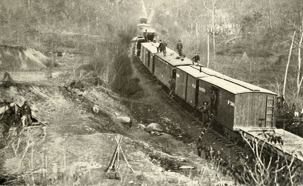 At this railroad point, three miles from the Court House, a Confederate provision train arrived on the morning of April 8th. The supplies were being loaded into wagons and ambulances by a detail of about four thousand men, many of them unarmed, when suddenly a body of Federal cavalry charged upon them, having reached the spot by a by-road leading from the Red House. After a few shots the Confederates fled in confusion. The cavalry drove them on in the direction of Appomattox Court House, capturing many prisoners, twenty-five pieces of artillery, a hospital train, and a large pack of wagons. This was Lee’s last effort to obtain food for his army.