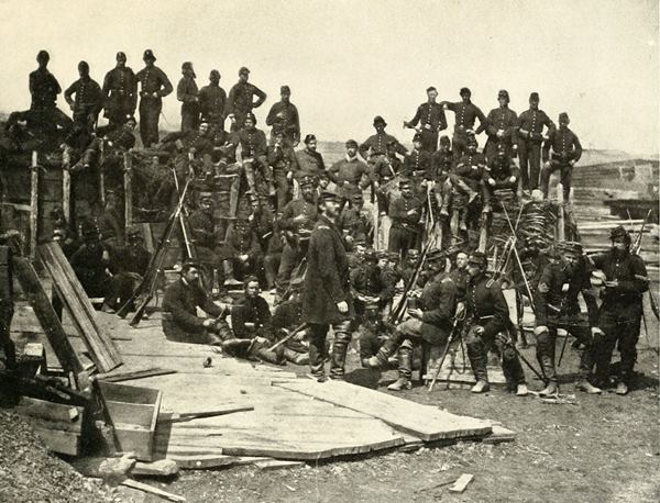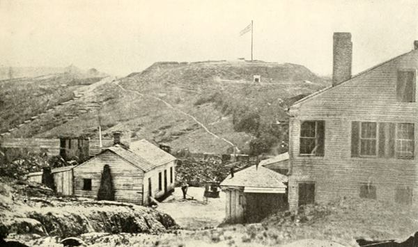 The upper photograph shows Confederates on Monday the fifteenth of April, 1861—one day after the momentous event which Holmes dimly prophesied in “Brother Jonathan” (page 44). The picture below, with the two following, were made on the 16th. As April wore on, North and South alike had been reluctant to strike first. When Major Robert Anderson, on December 26, 1860, removed to Fort Sumter, on an island at the entrance to Charleston Harbor, he placed himself in a position to withstand long attack. But he needed supplies. The Confederates would allow none to be landed. When at length rumors of a powerful naval force to relieve the fort reached Charleston, the Confederates demanded the surrender of the garrison. Anderson promised to evacuate by April 15th if he received no additional supplies. His terms were rejected. At half-past four on the morning of April 12th a shell from Fort Johnson “rose high in air, and curving in its course, burst almost directly over the fort.” The mighty war had begun.