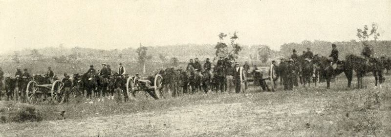 With guns loaded, and howitzers ready to pour their charges into an advancing force, the Southerners stood and watched the line of dust that arose above the trees. It moved slowly to the westward. Then, where the Sudley road turns to the southward to cross the Sudley Ford, it followed the[Pg 17] trend of the highway. It reached the crossing of Bull Run, and the line of dust faded as the Federals spread into battle-line behind the expanse of woodland that hid each column from the other’s view.