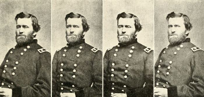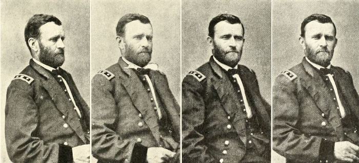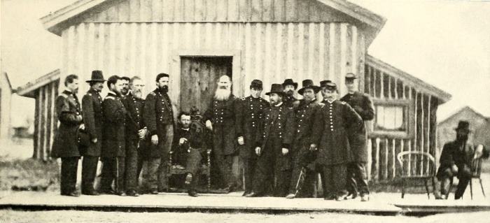 No photographer was present at Appomattox, that supreme moment in our national history, when Americans met for the last time as foes on the field. Nothing but fanciful sketches exist of the scene inside the McLean home. But here is a photograph that shows most of the Union officers present at the conference. Nine of the twelve men standing above stood also at the signing of Lee’s surrender, a few days later. The scene is City Point, in March, 1865. Grant is surrounded by a group of the officers who had served him so faithfully. At the surrender, it was Colonel T. S. Bowers (third from left) upon whom Grant called to make a copy of the terms of surrender in ink. Colonel E. S. Parker, the full-blooded Indian on Grant’s staff, an excellent penman, wrote out the final copy. Nineteen years later, General Horace Porter recorded with pride that he loaned General Lee a pencil to make a correction in the terms. Colonels William Duff and J. D. Webster, and General M. R. Patrick, are the three men who were not present at the interview. All of the remaining officers were formally presented to Lee. General Seth Williams had been Lee’s adjutant when the latter was superintendent at West Point some years before the war. In the lower photograph General Grant stands between General Rawlins and Colonel Bowers. The veins standing out on the back of his hand are plainly visible. No one but he could have told how calmly the blood coursed through them during the four tremendous years.