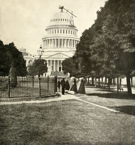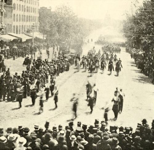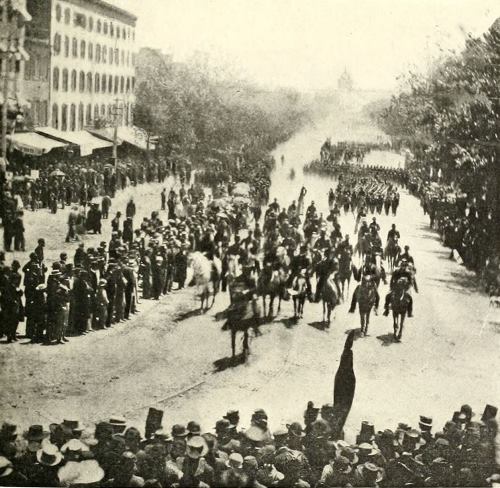One of the proudest days of the nation—May 24, 1865—here lives again. The true greatness of the American people was not displayed till the close of the war. The citizen from the walks of humble life had during the contest become a veteran soldier, equal in courage and fighting capacity to the best drilled infantry of Marlborough, Frederick the Great, or Napoleon. But it remained to be seen whether he would return peacefully to the occupations of peace. European nations made dark predictions. “Would nearly a million men,” they asked, “one of the mightiest military organizations ever trained in war, quietly lay aside this resistless power and disappear into the unnoted walks of civil life?” Europe with its standing armies thought not. Europe was mistaken. The disbanded veterans lent the effectiveness of military order and discipline to the industrial and commercial development of the land they had come to love with an increased devotion. The pictures are of Sherman’s troops marching down Pennsylvania Avenue. The horsemen in the lead are General Francis P. Blair and his staff, and the infantry in flashing new uniforms are part of the Seventeenth Corps in the Army of Tennessee. Little over a year before, they had started with Sherman on his series of battles and flanking marches in the struggle for Atlanta. They had taken a conspicuous and important part in the battle of July 22d east of Atlanta, receiving and finally repulsing attacks in both front and rear. They had marched with Sherman to the sea and participated in the capture of Savannah. They had joined in the campaign through the Carolinas, part of the time leading the advance and tearing up many miles of railway track, and operating on the extreme right after the battle of Bentonville. After the negotiations for Johnston’s surrender were completed in April, they set out on the march for the last time with flying colors and martial music, to enter the memorable review at Washington in May, here preserved.