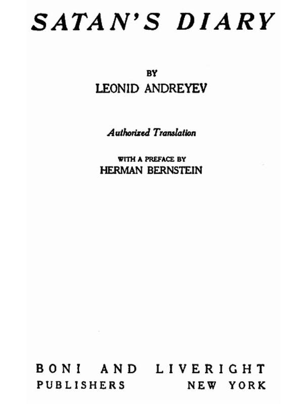 The Project Gutenberg EBook of Satan's Diary, by Leonid Andreyev This eBook is for the use of anyone anywhere at no cost and with almost no restrictions whatsoever. You may copy it, give it away or re-use it under the terms of the Project Gutenberg License included with this eBook or online at www.gutenberg.org Title: Satan's Diary Author: Leonid Andreyev Release Date: May 8, 2013 [EBook #42665] Language: English Character set encoding: UTF-8 *** START OF THIS PROJECT GUTENBERG EBOOK SATAN'S DIARY *** Produced by Dianna Adair, Richard Hulse and the Online Distributed Proofreading Team at http://www.pgdp.net (This file was produced from images generously made available by The Internet Archive)