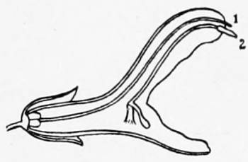 | Labiate. Lipped. Applied to the calyx or the corolla of a flower when it is divided into two lips. | |
