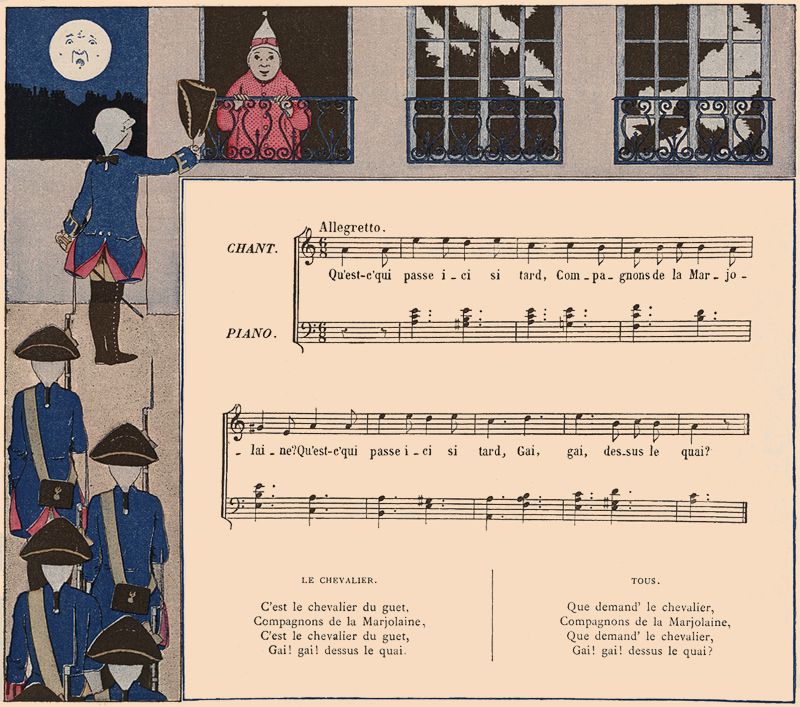 L'enfant qui représente le chevalier du guet chante seul le deuxième couplet devant un groupe d'enfants qui lui répondent, et ainsi de suite jusqu'à la fin, où il choisit une jeune fille qui se sépare du groupe. Ils s'enfuient tous les deux, poursuivis par les autres enfants.