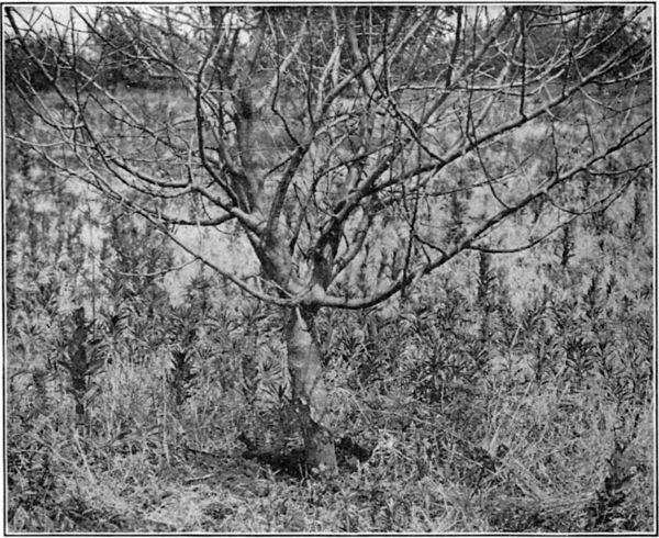 Older orchard trees sometimes are killed by meadow mice. In Kansas in 1903 the writer saw hundreds of apple trees, 8 to 10 years planted, and 4 to 6 inches in diameter, completely girdled by these pests. (Fig. 2.) The list of cultivated trees and shrubs injured by these animals includes nearly all those grown by the horticulturist. The Biological Survey has received complaints of the destruction of apple, pear, peach, plum, quince, cherry, and crab-apple trees, of blackberry, raspberry, rose, currant, and barberry bushes, and of grape vines; also of the injury of sugar maple, black locust, Osage orange, sassafras, pine, alder, white ash, mountain ash, oak, cottonwood, willow, wild cherry, and other forest trees.