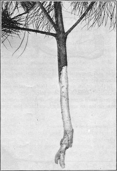 In the eastern part of the United States pine mice do more damage to orchards than do meadow mice, partly because their work is undiscovered until trees begin to die. The runs of meadow mice under grass or leaves are easily found and the injury they do to trees is always visible. On the other hand, depredations by pine mice can be found only after digging about the tree and exposing the trunk below the surface. The roots of small trees are often entirely eaten off by pine mice, and pine trees as well as deciduous forest trees, when young, are frequently killed by these animals (fig. 4).