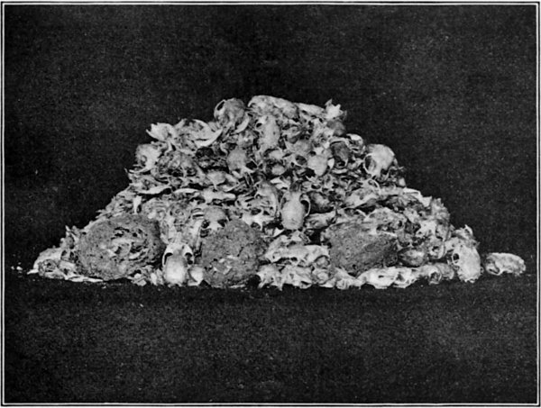 The barn owl is rather common in the southern half of the United States and breeds as far north as the forty-first parallel of latitude. That mice form the chief diet of this bird has been demonstrated by Dr. A. K. Fisher, of the Biological Survey, through examination of stomachs of many barn owls and also of large numbers of pellets (castings from their stomachs) found under their roosts. In 1,247[Pg 10] barn-owl pellets collected in the towers of the Smithsonian Building in Washington, D. C., he found 1,991 skulls of short-tailed field mice, 656 of the house mouse, 210 of the common rat, and 147 of other small rodents and shrews. Very few remains of birds were found. Figure 7 illustrates the contents of some of these pellets.